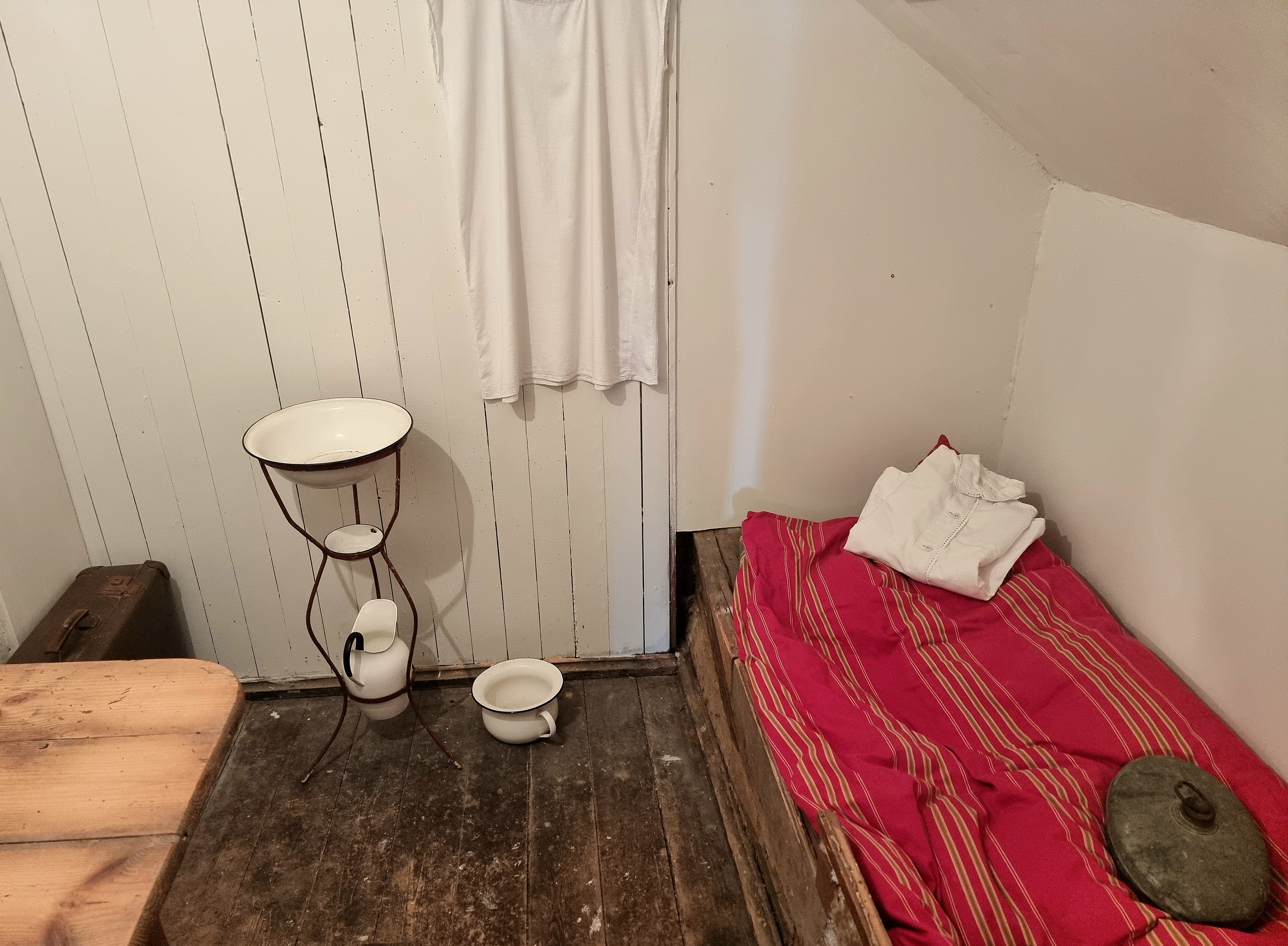 Pigeværelset var lille og uden udstyr end det, du ser. Køkkenhjælpen eller højskoleeleven skulle selv medbringe en kasse eller lignende med sine ting