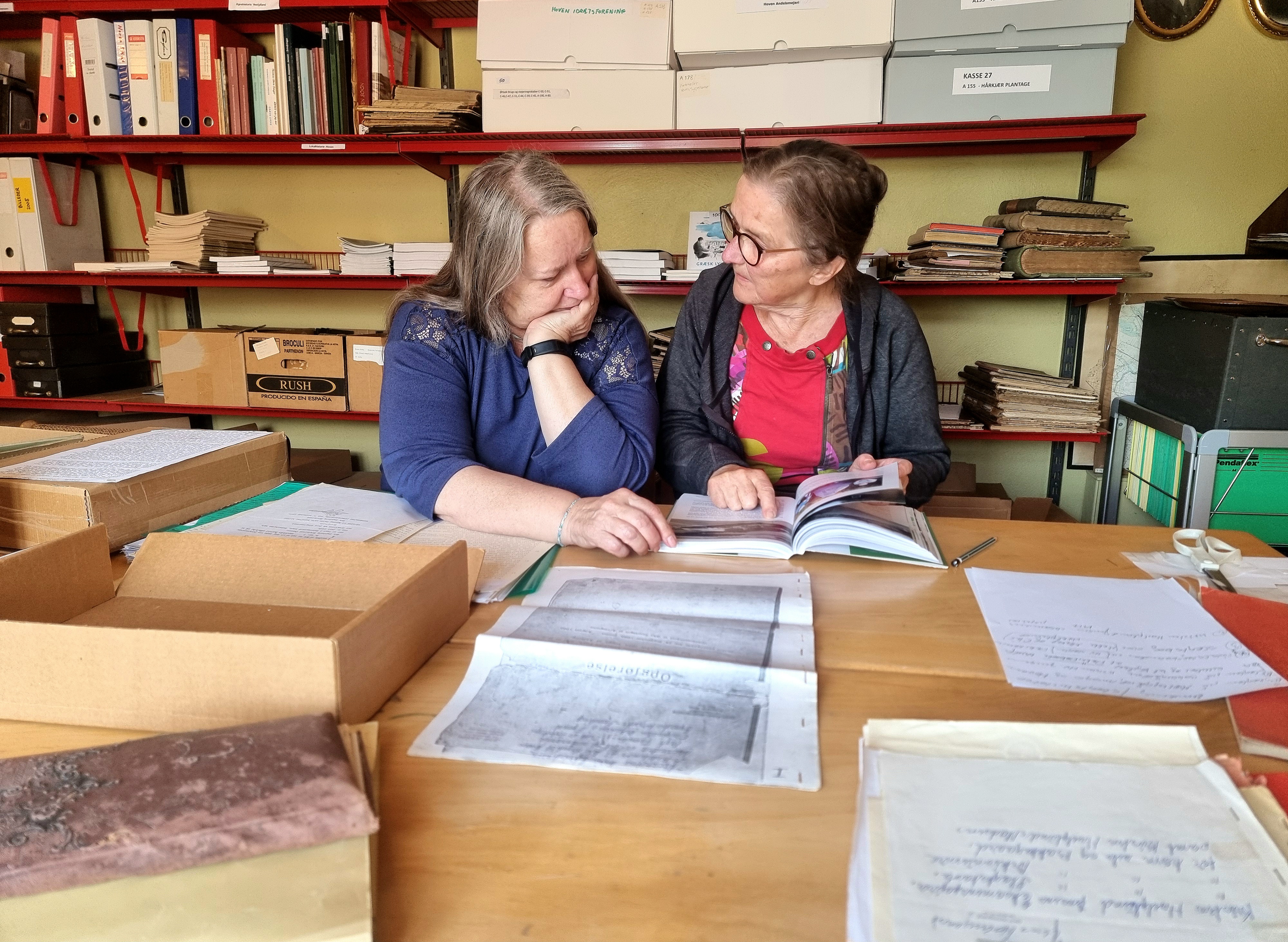 Birgit Jespersen, til venstre, og Karen Thomsen er ved at sammenligne og redigere to slægtstavler for samme slægt sammen fra to forskellige dokumenter i det lokalhistoriske arkiv