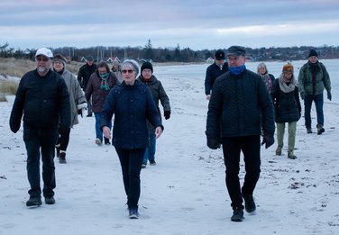Turen på de 4 km foregår mest på asfaltvej og kun en kort strækning på sandstranden.  Den vil også foregå efter alle corona-restriktioner. Vi har sat et maksimum 20 deltagere ud over arrangørerne så vi med afstand alligevel kan høre, hvad Lisbeth fortæller.